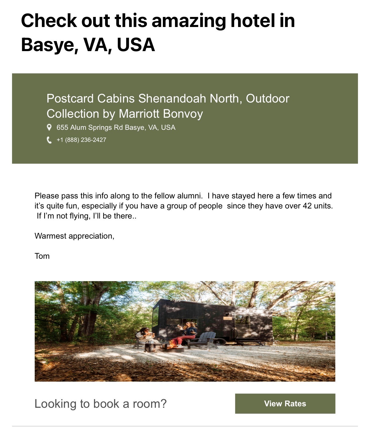Hyatt Place, Harrisonburg The following link will take you to a booking page with code for 20% discount https://www.hyatt.com/en-US/hotel/virginia/hyatt-place-harrisonburg/chozh?corp_id=167733